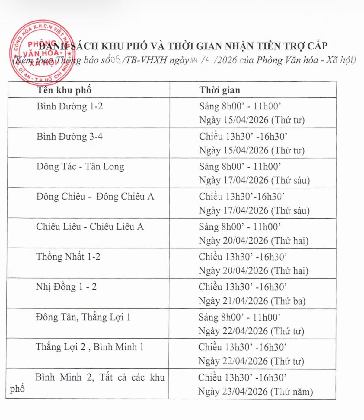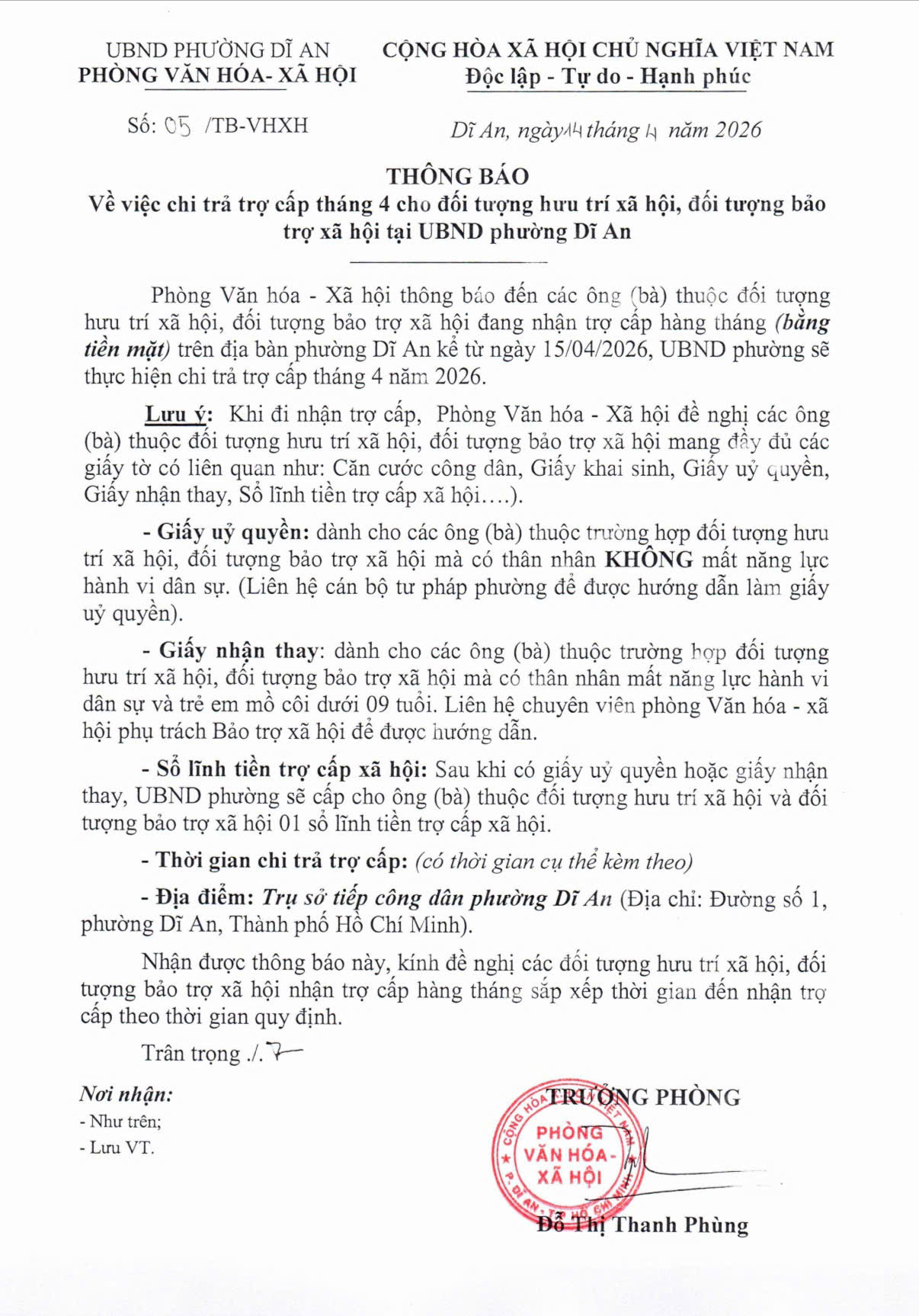 Thông báo về việc chi trả trợ cấp tháng 4 cho đối tượng hưu trí xã hội, đối tượng bảo trợ xã hội tại UBND phường Dĩ An. 15:50 14/04/20264 lượt xem In Nghe A Chia sẻ Tài liệu đính kèmCÙNG CHUYÊN MỤC